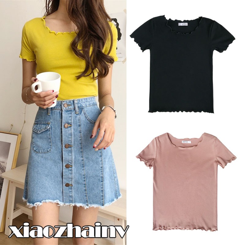 Bayar Di Tempat Xiaozhainv Leher Bulat Telinga Kayu Lengan Pendek Kaos Polos 9 Warna